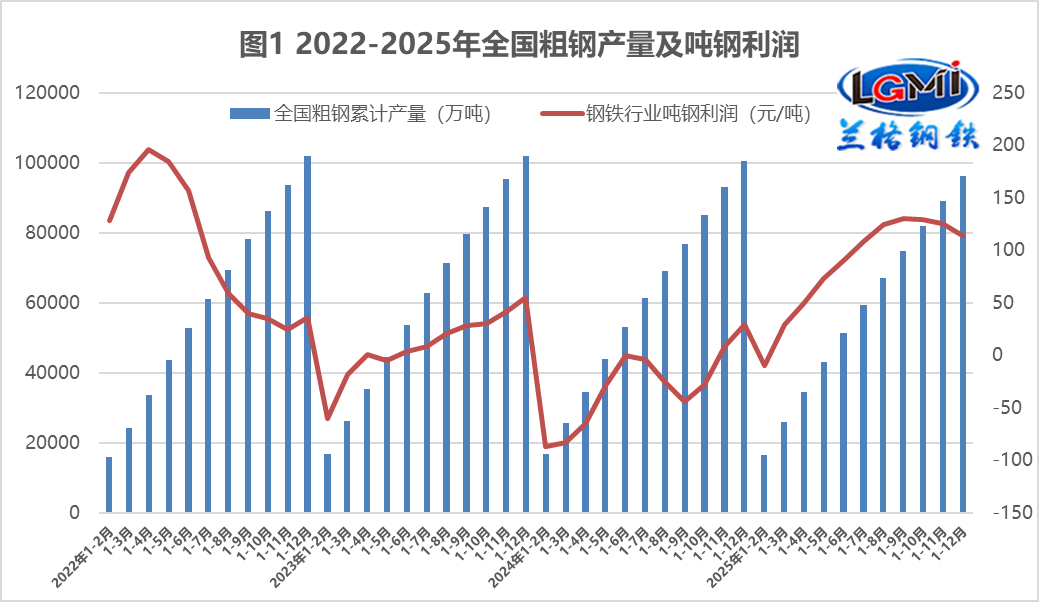 2025年,在國(guó)內(nèi)外復(fù)雜環(huán)境、積極有為宏觀政策、投資結(jié)構(gòu)不斷優(yōu)化、消費(fèi)擴(kuò)容提質(zhì)升級(jí)、工業(yè)持續(xù)向優(yōu)向新、鋼材出口再創(chuàng)新高等多重因素的影響下,國(guó)內(nèi)鋼鐵市場(chǎng)價(jià)格呈現(xiàn)了震蕩下跌的行情,由于原料成本下降的影響,使得2025年鋼鐵行業(yè)盈利明顯恢復(fù)。從季度數(shù)據(jù)來看,一季度鋼鐵行業(yè)盈利75.1億元,同比由虧轉(zhuǎn)盈;二季度鋼鐵行業(yè)盈利387.7億元,同比增加177.2億元;三季度鋼鐵行業(yè)盈利510.6億元,同比由虧轉(zhuǎn)盈;四季度鋼鐵行業(yè)盈利124.9億元,同比減少508億元。