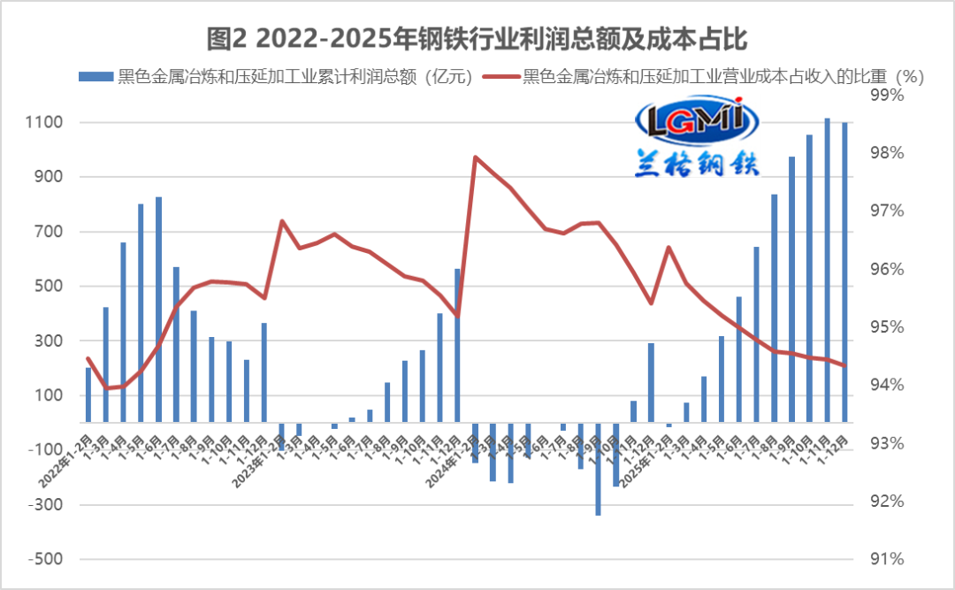 從全國(guó)粗鋼產(chǎn)量及噸鋼利潤(rùn)的數(shù)據(jù)來看,2025年國(guó)內(nèi)鋼鐵生產(chǎn)企業(yè)處于“控產(chǎn)維持利潤(rùn)、利潤(rùn)先擴(kuò)后縮”的局面,2025年整體噸鋼盈利114元,較上年同期增加85元(詳見圖1)。從營(yíng)業(yè)成本來看,雖然2025年成本有所下降但維持相對(duì)高位,營(yíng)業(yè)成本占營(yíng)業(yè)收入的比重為94.3%,較上年同期下降1.1個(gè)百分點(diǎn)(詳見圖2)。從鋼企利潤(rùn)率來看,2025年鋼企盈利能力有所增強(qiáng),成本利潤(rùn)率為1.51%,較上年上升1.13個(gè)百分點(diǎn);銷售利潤(rùn)率為1.42%,較上年上升1.06個(gè)百分點(diǎn)(詳見圖3)。