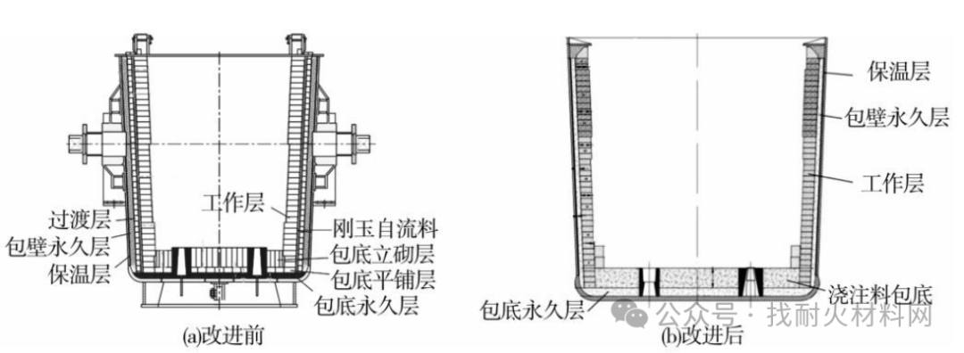 包壁設(shè)計(jì):根據(jù)當(dāng)前的實(shí)際情況,確定通過(guò)減少鋼包砌磚厚度擴(kuò)大鋼包內(nèi)徑的方案來(lái)實(shí)現(xiàn)擴(kuò)容,去掉修包壁過(guò)渡層使用80mm保溫磚,去掉包壁過(guò)渡層和工作層之間40mm剛玉自流料,鋼包擴(kuò)容后取消包沿磚,使用渣線磚代替,否則凈空不能滿足精煉要求。經(jīng)計(jì)算,鋼包凈空高度為400mm時(shí),鋼包容量為132t,達(dá)到了優(yōu)化設(shè)計(jì)的要求,滿足了盛裝130t鋼水裝入量的生產(chǎn)需求。原始設(shè)計(jì)方案和改進(jìn)后設(shè)計(jì)方案見(jiàn)圖1。