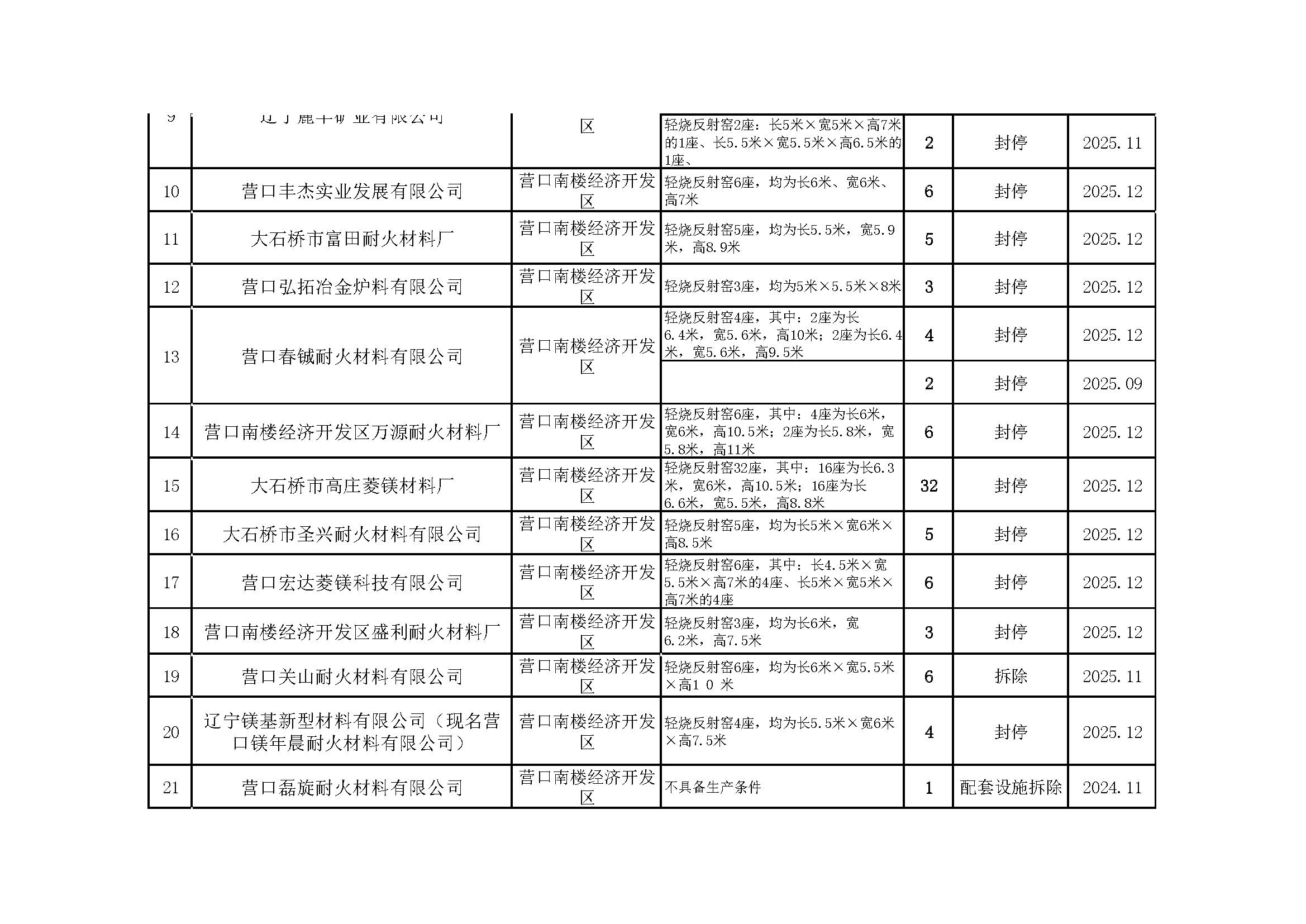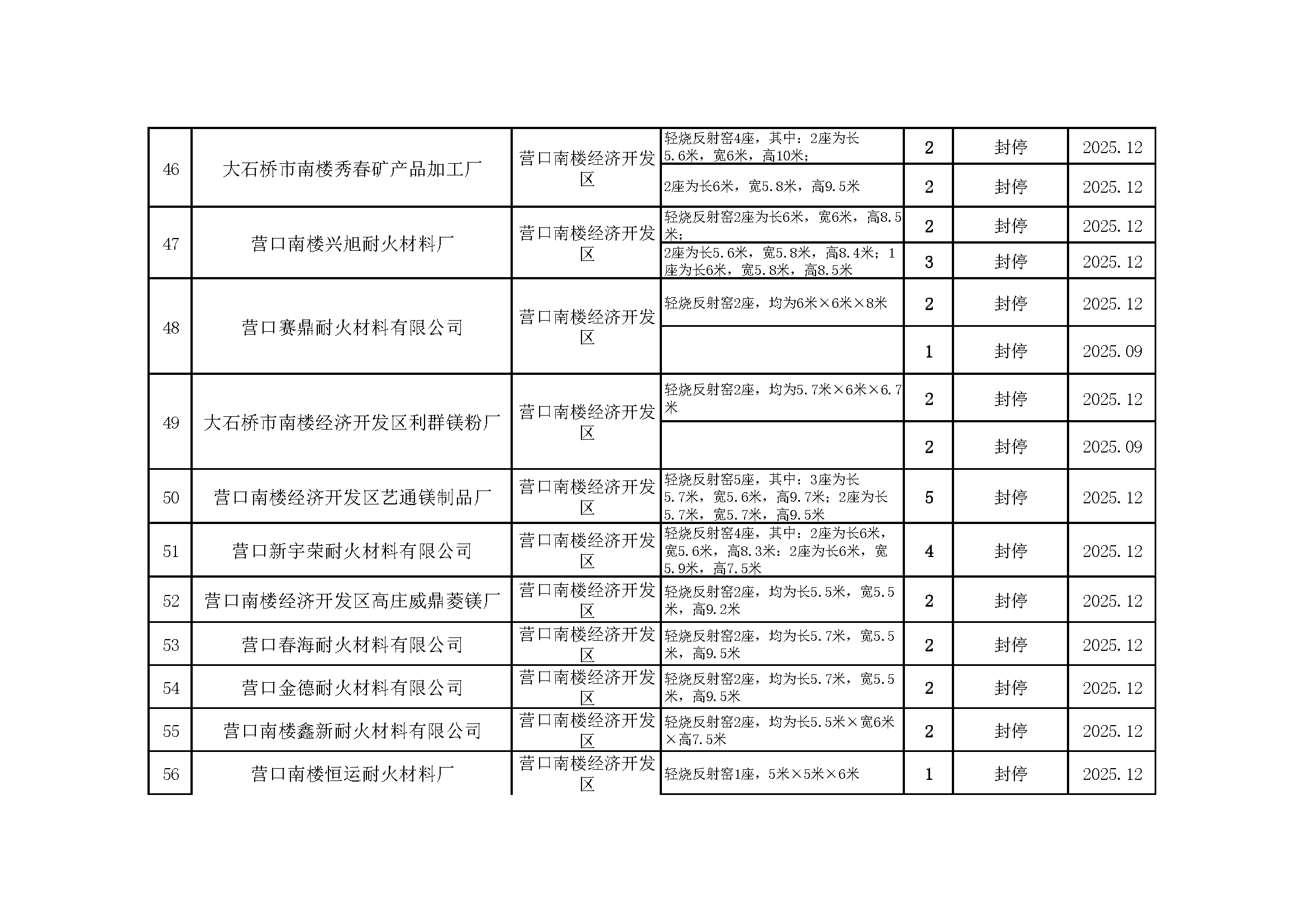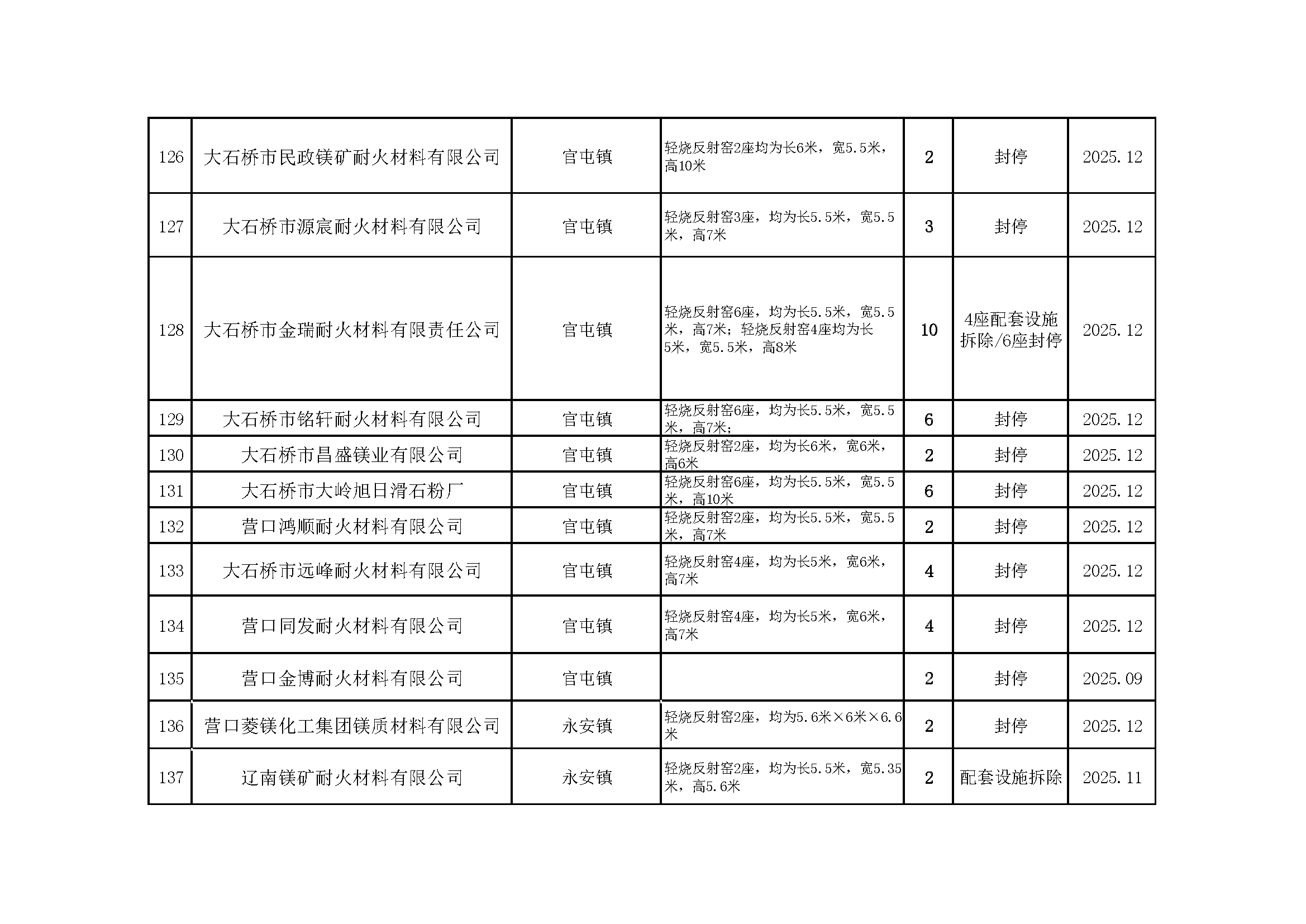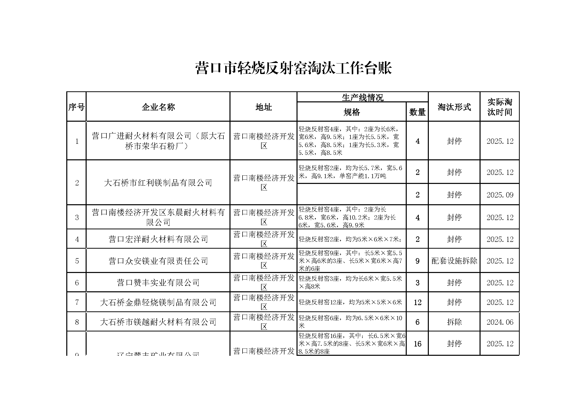 依據(jù)《遼寧省人民政府辦公廳關(guān)于推進(jìn)菱鎂行業(yè)高質(zhì)量發(fā)展的實(shí)施意見》(遼政辦發(fā)〔2023〕15號(hào))及《遼寧省輕燒反射窯淘汰工作方案》(遼工信建材〔2024〕18號(hào))要求,我市對(duì)轄區(qū)內(nèi)輕燒反射窯開展封停淘汰工作。截至2026年1月31日,全部核驗(yàn)完畢,現(xiàn)將相關(guān)淘汰情況予以通告,接受社會(huì)監(jiān)督。企業(yè)或個(gè)人若對(duì)淘汰工作有異議,可如實(shí)反映有關(guān)情況。