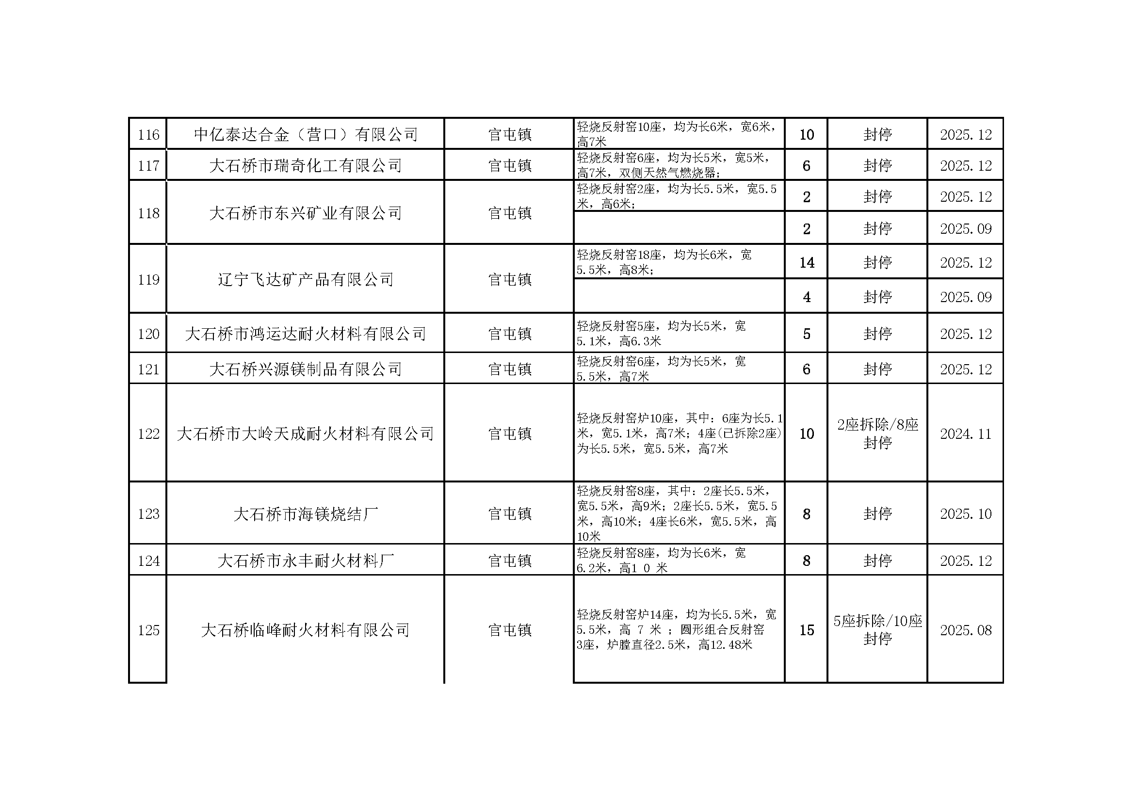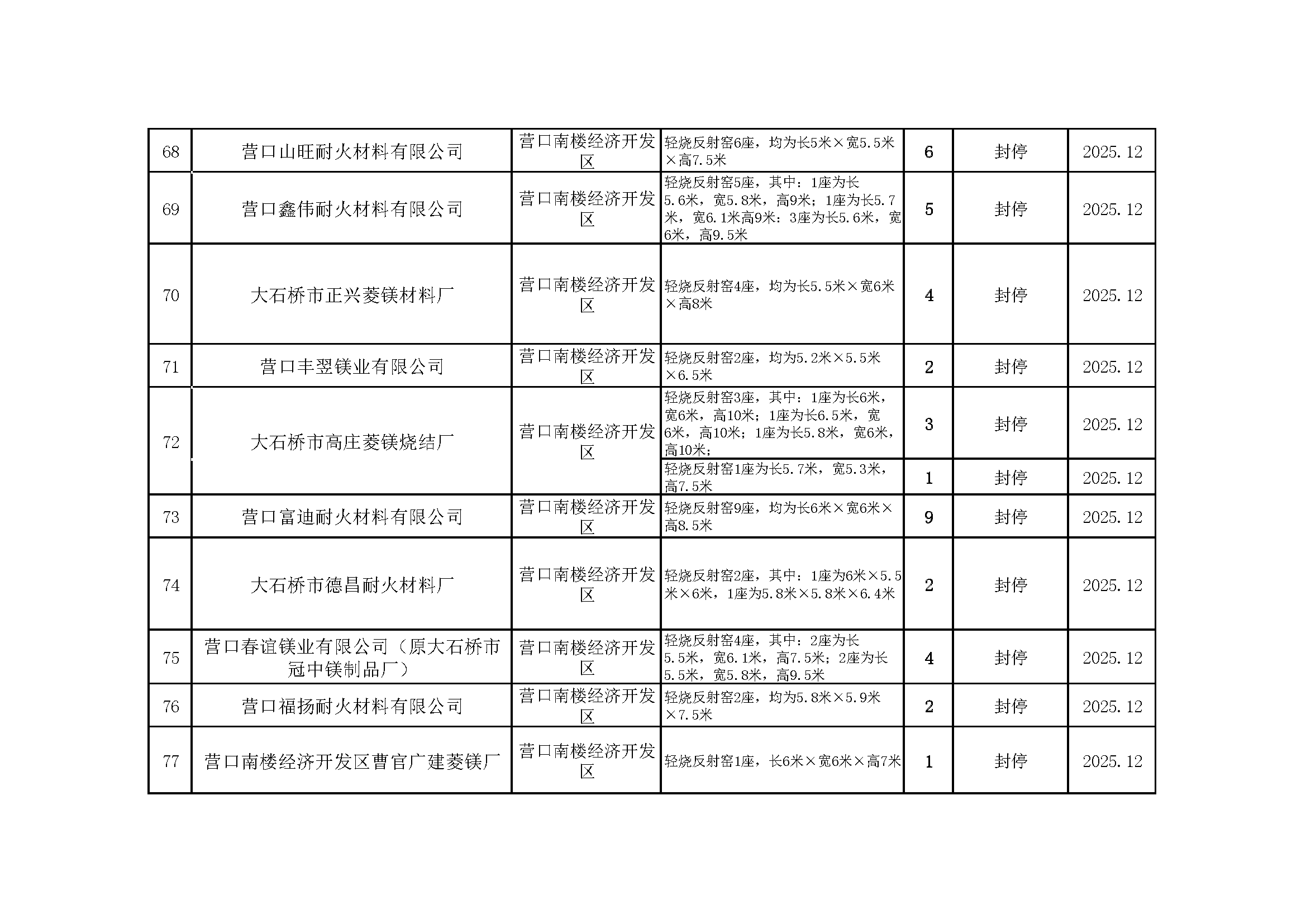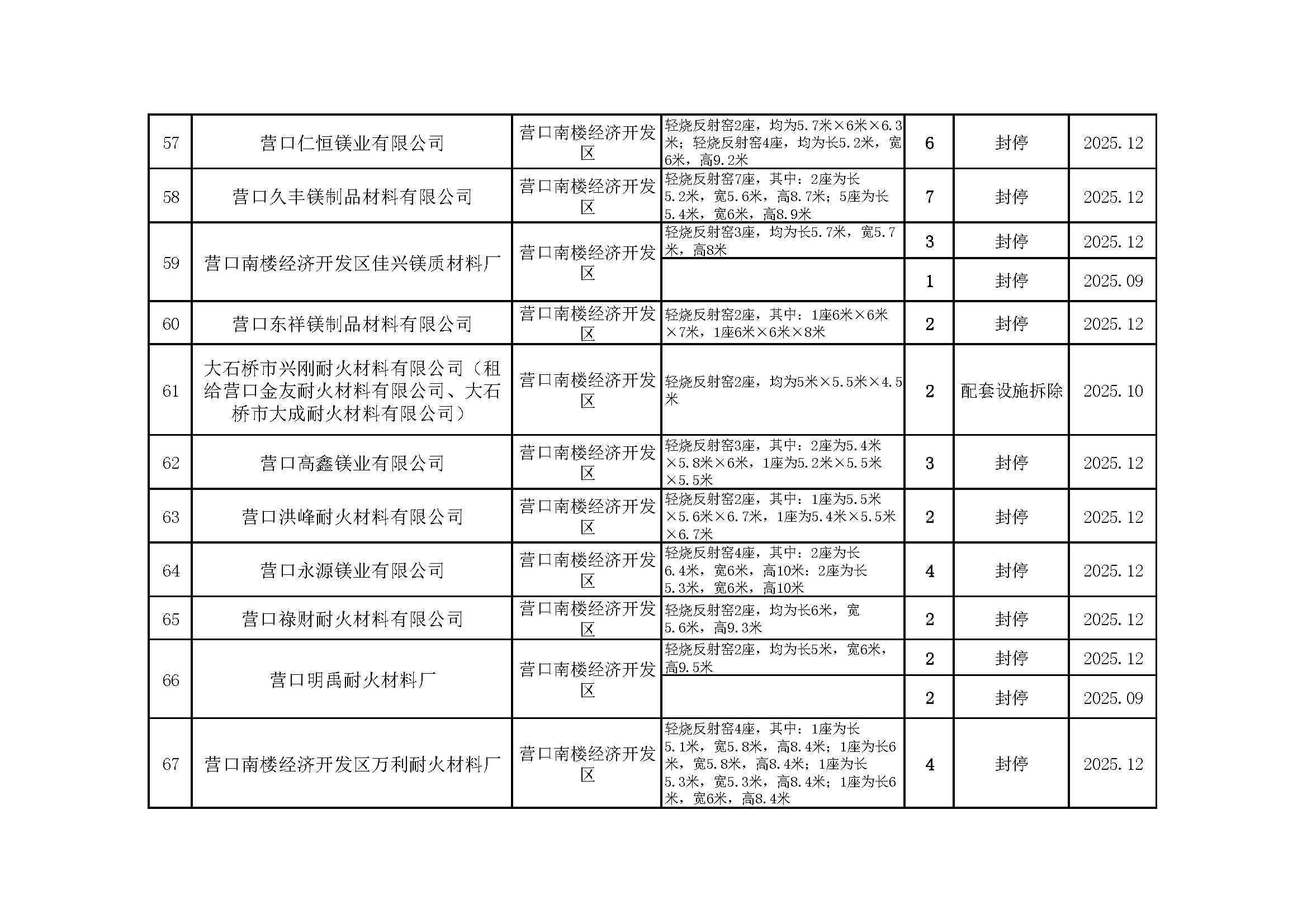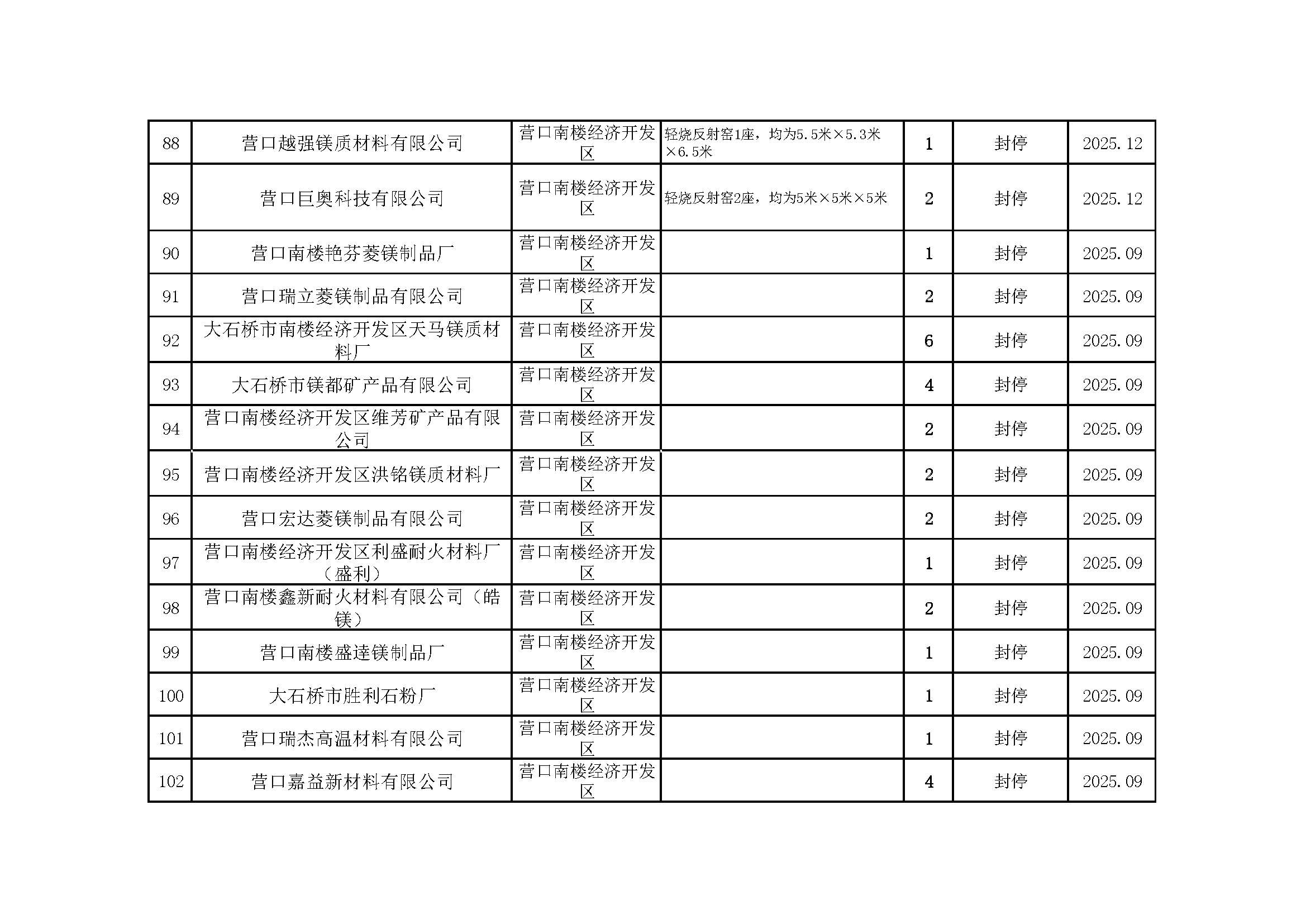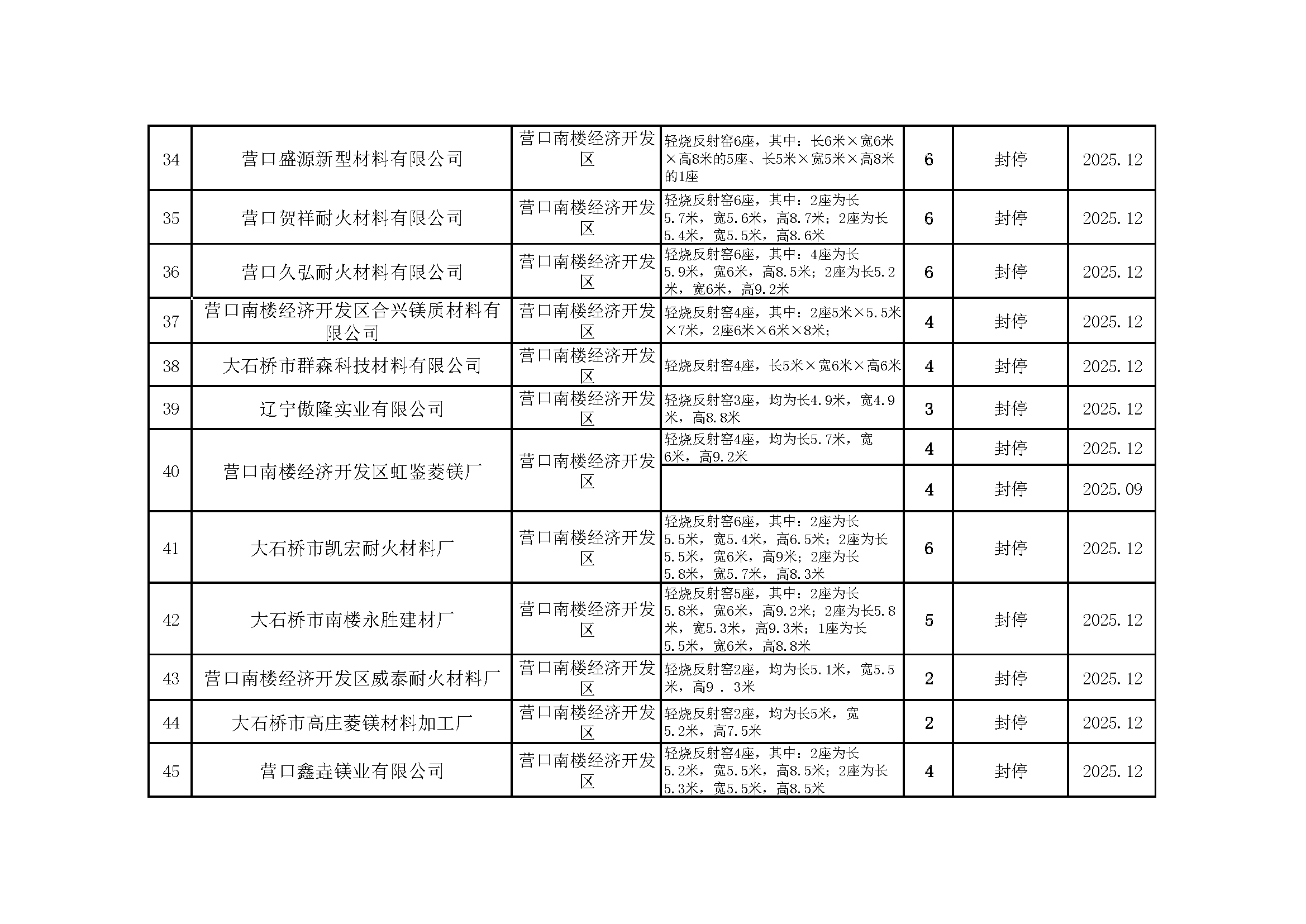 依據(jù)《遼寧省人民政府辦公廳關(guān)于推進(jìn)菱鎂行業(yè)高質(zhì)量發(fā)展的實(shí)施意見》(遼政辦發(fā)〔2023〕15號(hào))及《遼寧省輕燒反射窯淘汰工作方案》(遼工信建材〔2024〕18號(hào))要求,我市對(duì)轄區(qū)內(nèi)輕燒反射窯開展封停淘汰工作。截至2026年1月31日,全部核驗(yàn)完畢,現(xiàn)將相關(guān)淘汰情況予以通告,接受社會(huì)監(jiān)督。企業(yè)或個(gè)人若對(duì)淘汰工作有異議,可如實(shí)反映有關(guān)情況。