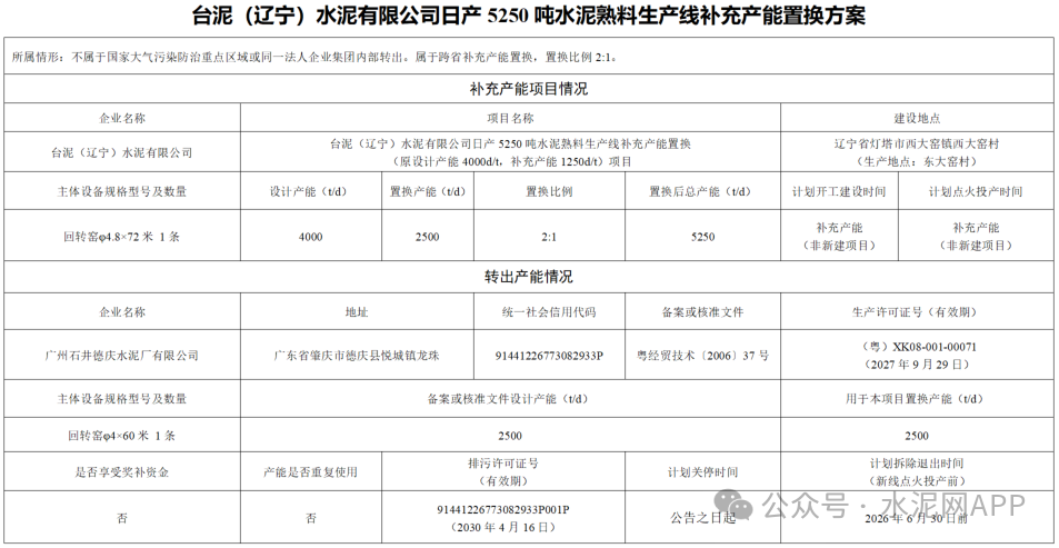置換方案顯示,臺泥(遼寧)水泥4000t/d熟料生產(chǎn)線補(bǔ)充產(chǎn)能1250t/d,補(bǔ)齊后產(chǎn)能5250t/d,退出產(chǎn)能來自廣州石井德慶水泥一條2500t/d生產(chǎn)線,置換比例2:1。