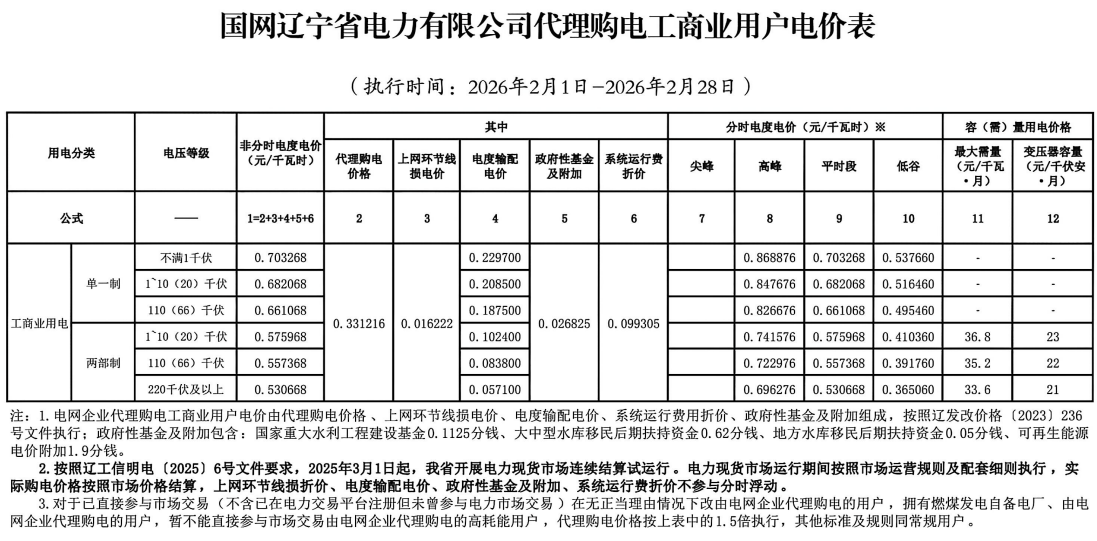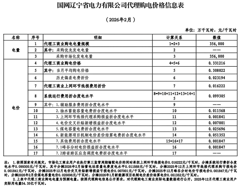 國網(wǎng)遼寧省電力有限公司代理購電工商業(yè)用戶電價(jià)表(2026年2月)