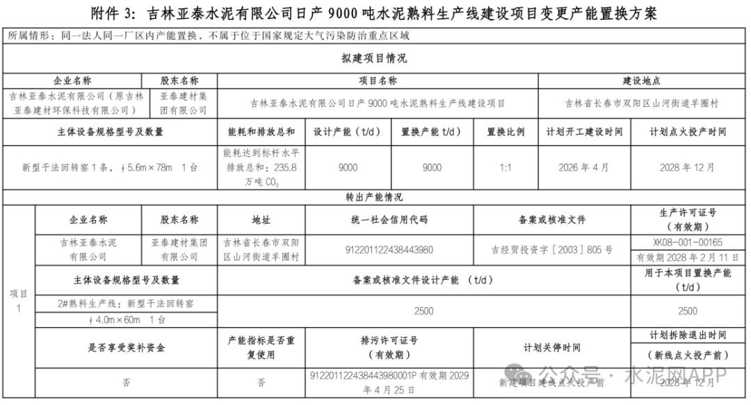 3月13日,吉林省工信廳發(fā)布吉林亞泰水泥有限公司日產(chǎn)9000噸水泥熟料生產(chǎn)線建設(shè)項目變更產(chǎn)能置換方案的公示。結(jié)合新舊置換方案顯示,原建設(shè)主體由吉林亞泰建材環(huán)??萍加邢薰咀兏鼮榧謥喬┧嘤邢薰?;原計劃點火投產(chǎn)時間由2027年12月變更為2028年12月;置換產(chǎn)能退出時間由2027年12月變更為2028年12月。