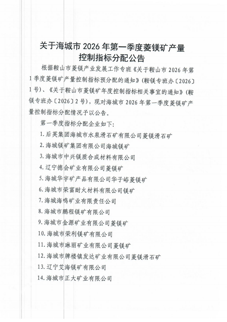 關(guān)于海城市2026年第一季度菱鎂礦產(chǎn)量控制指標(biāo)分配公告?